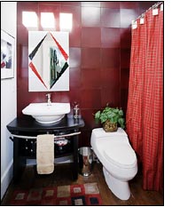 This simple, elegant hall bathroom is reminiscent of days when men retreated to smoke cigars, play cards and have cocktails after dinner. The console made of wenge wood, the white porcelain sink, attached chrome towel bar and chrome faucet add an updated appearance by using clean, simple lines and form. The shelf underneath the sink is ideal for minimal storage in a bath that is mostly used by guests. The leather tiles with warm gray walls provide a rich sense of style, color, warmth and interest. The rich red, tan, and black plaid shower curtain adds color and elegance. The lighting fixtures resemble dice and are fun while still being functional. Accessories, like the custom designed metal and stained-glass "diamond" mirror, shower curtain tabs, and artwork, using cards and the four suits give details their unique character. This transitional space is ideal in a historic home where men and women alike can imagine those days gone by while enjoying a simple, updated look in a somewhat whimsical space!