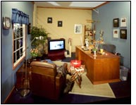 Artworks depicting architecture and race cars stand out against the soft blue and tan walls. A suspended model airplane appears to fly. The cherry executive desk with ebony inlay is an elegant and functional place for him to work on his computer, make phone calls or plan business strategies. The Aeron Chair is ergonomically correct to minimize fatigue. The brown leather club chair is placed in front of the Bang & Olufsen television where he can be comfortable while viewing his state-of-the-art equipment or while reading his favorite book. This gentleman's retreat, located downstairs from the family's daily routine, offers an escape from the day's challenges.